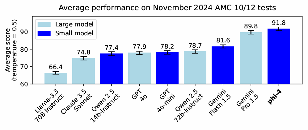 2024년 12월 발표한 Phi-4는 기존 Phi 모델들과 같이, 경량화 모델에 초점을 두었습니다. Phi-4는 140억 개의 매개 변수를 가진 고품질 모델로 STEM 중심의 Q&A 문제에 대해 GPT-4 를 능가하는 성능을 보인다고 발표를 하였습니다.