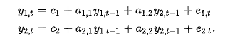 수식은 2개의 시계열 데이터가 있을 때 공식을 나타낸것이다. 이러한 모델은 VAR(1) 모델이라 하며 lag order 이 1 인 VAR 모델이다.