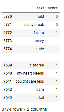 df.iloc[int(7544/2):]['score'] = 1 #처음 반은 positive 나머지 반은 negative words