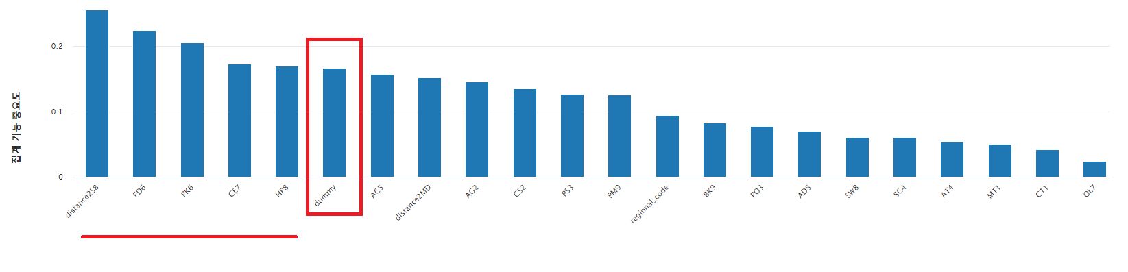 랜덤 feature를 생성 후 feature importance를 순서대로 나열해 보면 위와 같이 나오게 됩니다. 방금 임의로 생성한 dummy 라는 variable 도 들어가 있는것을 확인할 수 있습니다. 이와 같은경우, dummy 아래의 variable 을 지울 때의 리스크는 랜덤 숫자를 지울때의 리스크 보다 낮다고 판단하여 지우고 더 위의 랭킹에 있는 feature들만 사용하여 학습을 하는 것 입니다.(위의 경우 5가지: distance2SB, FD6, PK6, CE7, HP8)